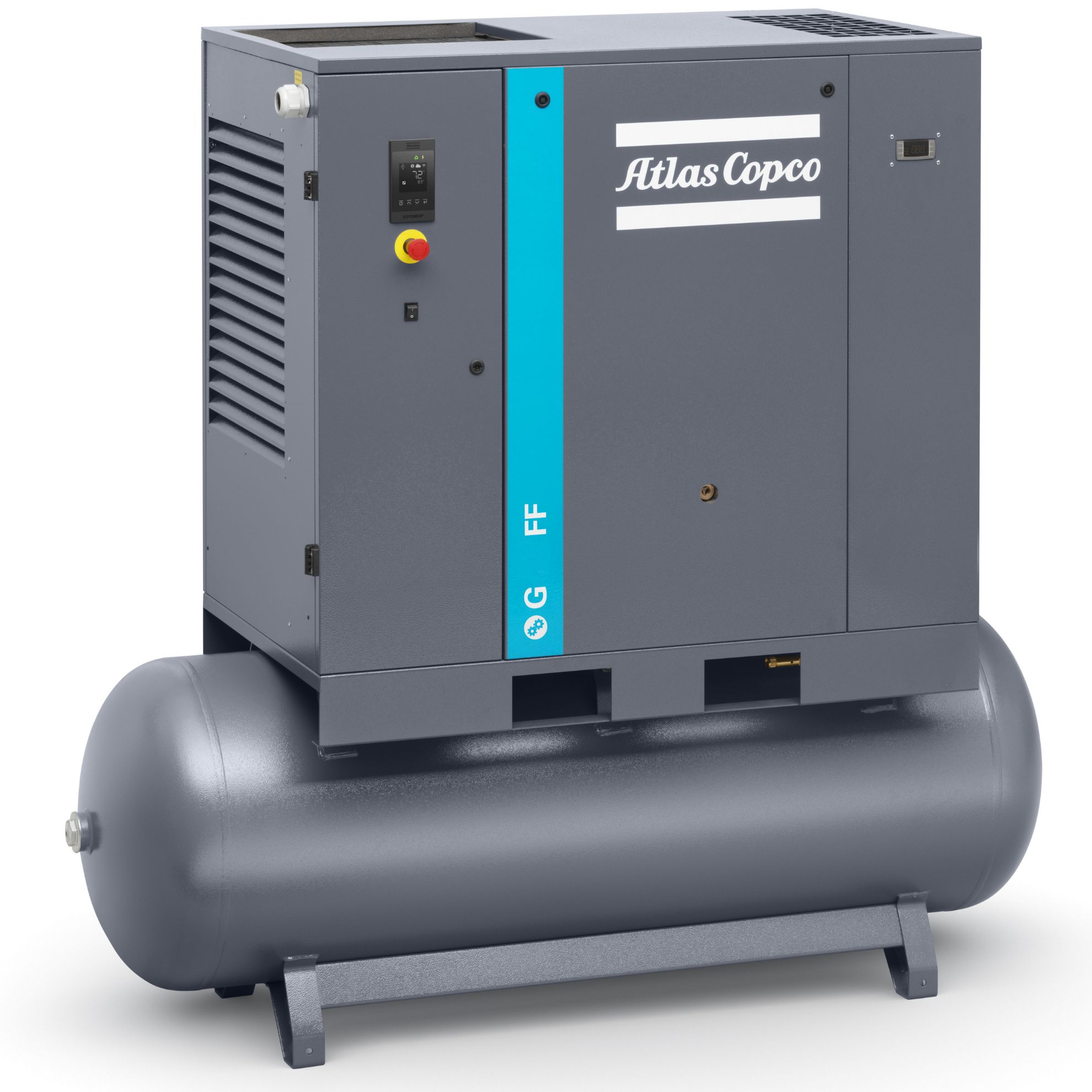 The Atlas Copco G22FF is a 30hp rotary screw air compressor with integrated refrigerated air dryer and 132 gallon receiver tank. The G22 Full Feature compressor delivers 114 CFM at 125 psi. The Atlas Copco G22 Full Feature rotary screw air compressor is a dependable, space-saving compressed air solution that includes all necessary components in an air system: compressor, tank and dryer. Designed for shops and industrial operations that need steady performance in a compact footprint.