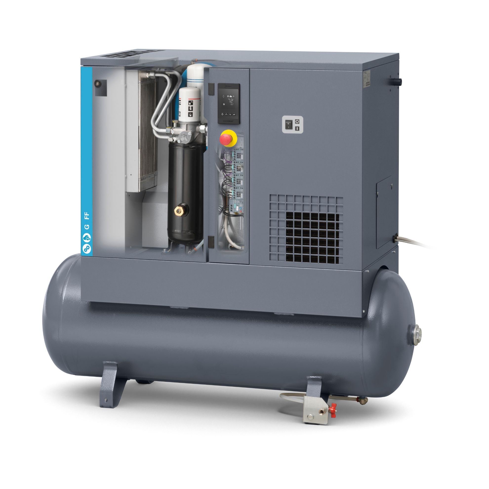 The 'FF' in the model number signifies that the G5 compressor is a 'Full Feature' model complete with a high performance air compressor dryer. The integrated dryer will help to reduce and eliminate water and rust from accumulating in the tank, and also prevents water from flowing through the pipes and into the finished product.