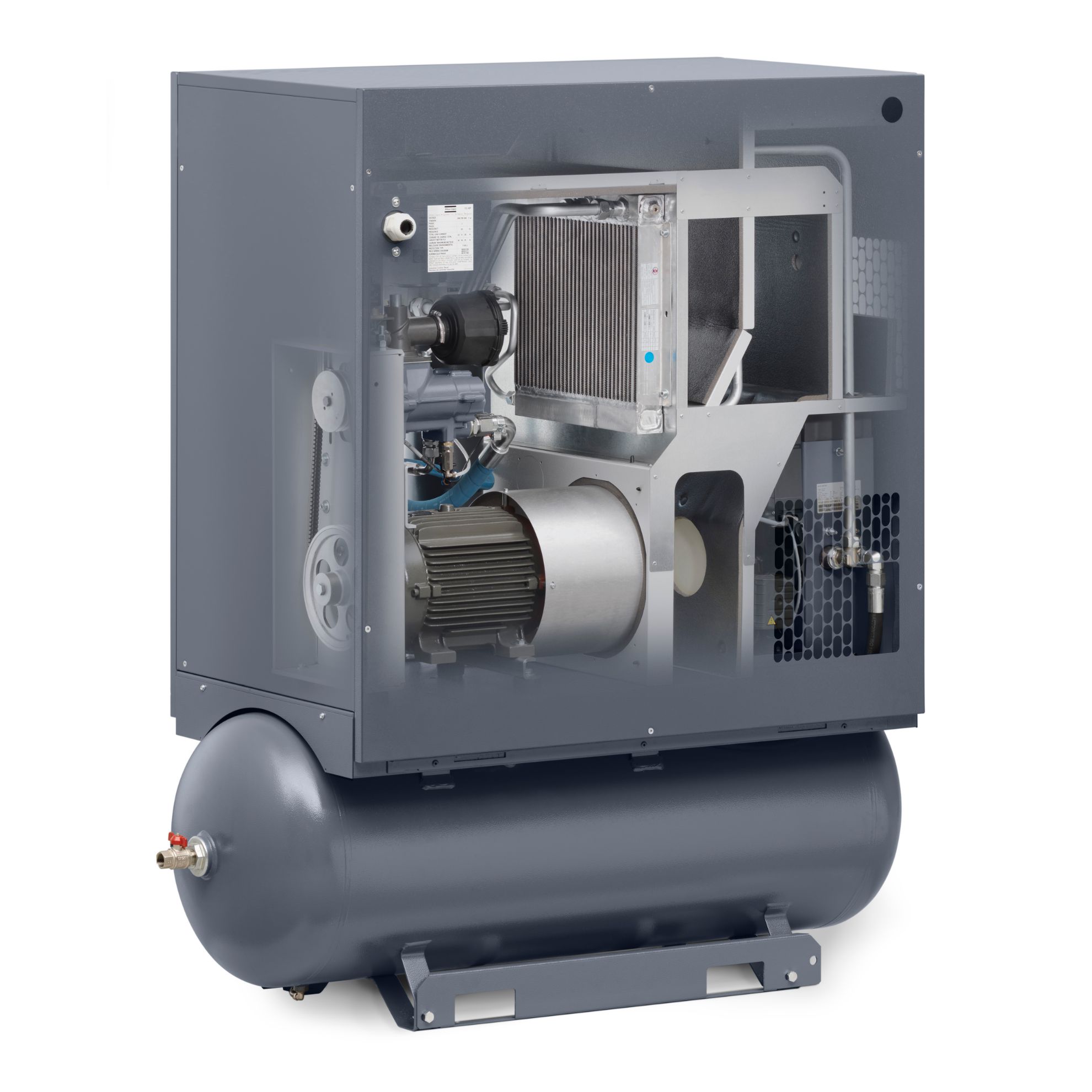 This configuration is the Full Feature model mounted on a 132-gallon air receiver and has a pre-installed integrated dryer. The GA18FF is a dependable, space-saving compressed air solution that includes all necessary components in an air system: compressor, tank and dryer. Since all components are pre-plumbed into a single system, installation is a breeze - Just plug and play! .
