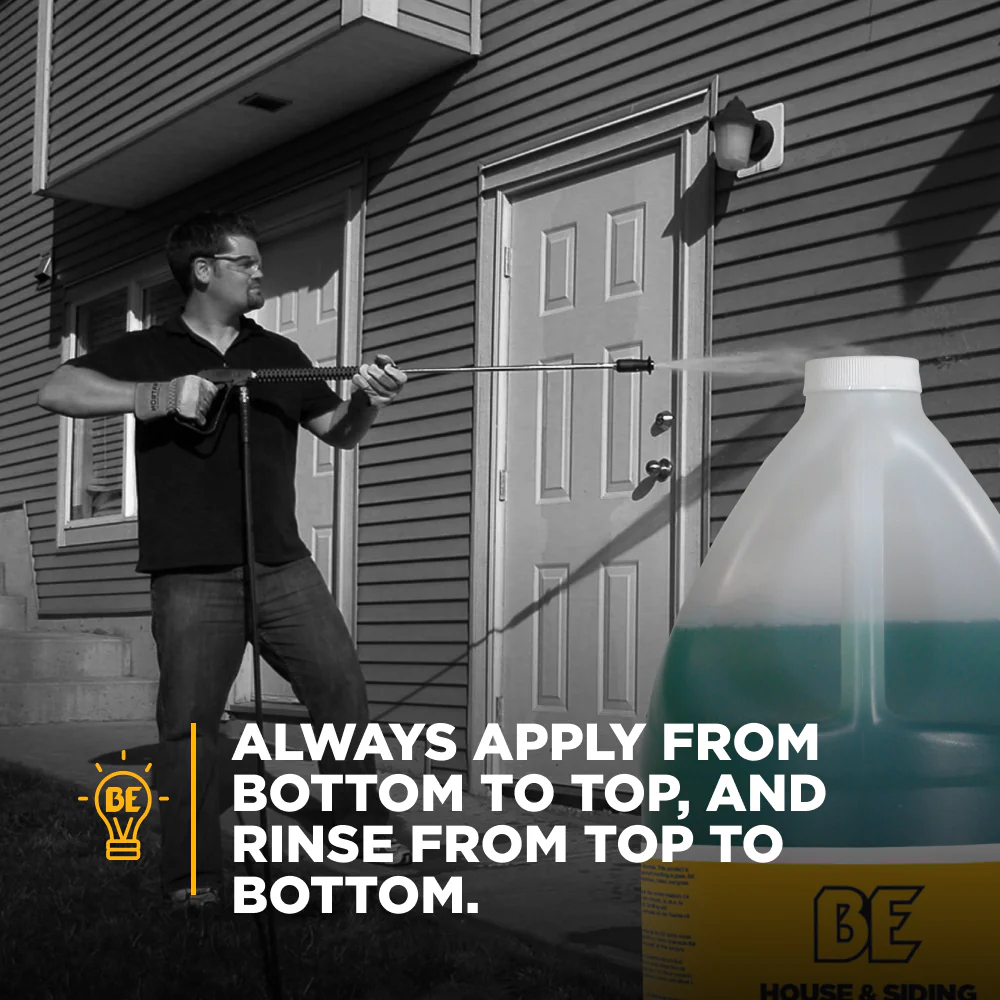 The BE Pressure Washer House and Siding Detergent is designed specifically for pressure washers, making it the ideal choice for property owners and contractors looking to maintain residential or light commercial buildings. The formula clings to vertical surfaces and penetrates deeply into textured siding, surface pores, and corners — lifting out built-up residues that cause discoloration and mildew growth.